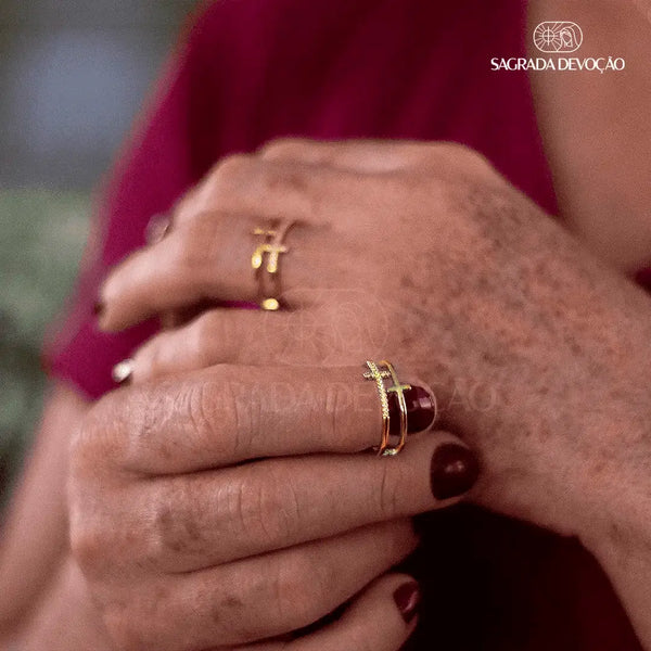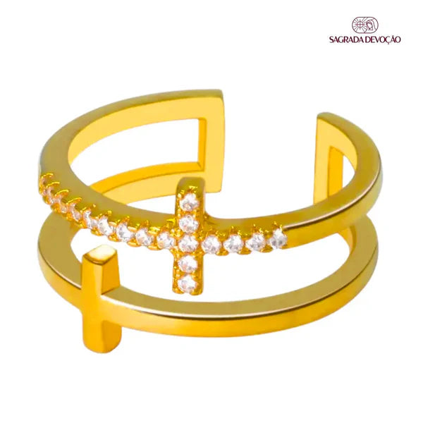 Anel de Cruz Dupla Folheado a Ouro e Prata 925 - Ajustável